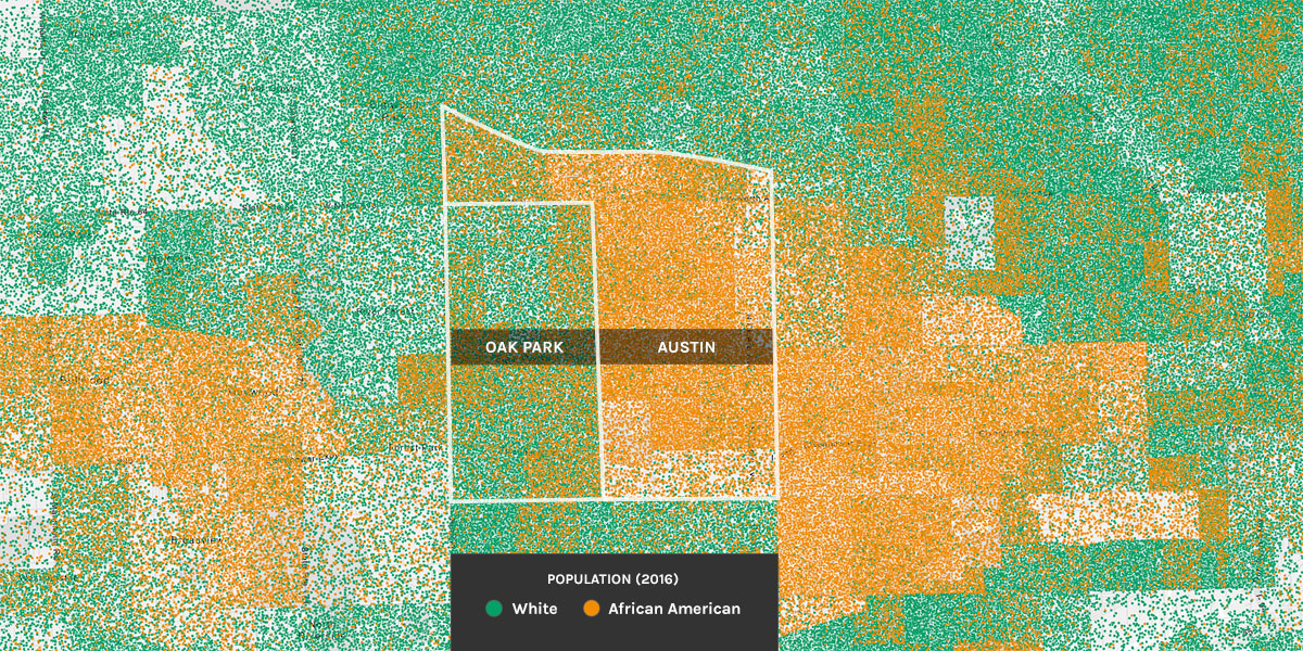 On the west side of Chicago, two historic neighborhoods sit side by side. They are divided by the city limit of Chicago. The Austin neighborhood dates to 1870 with an early “L” train transforming it to vibrant 1920s community, while adjacent Oak Park was made famous by American architect Frank Lloyd Wright. But today, under the difficult race history of the city, Austin is known as a black neighborhood, Oak Park is known as white, and dividing Austin Blvd. marks an invisible line between.